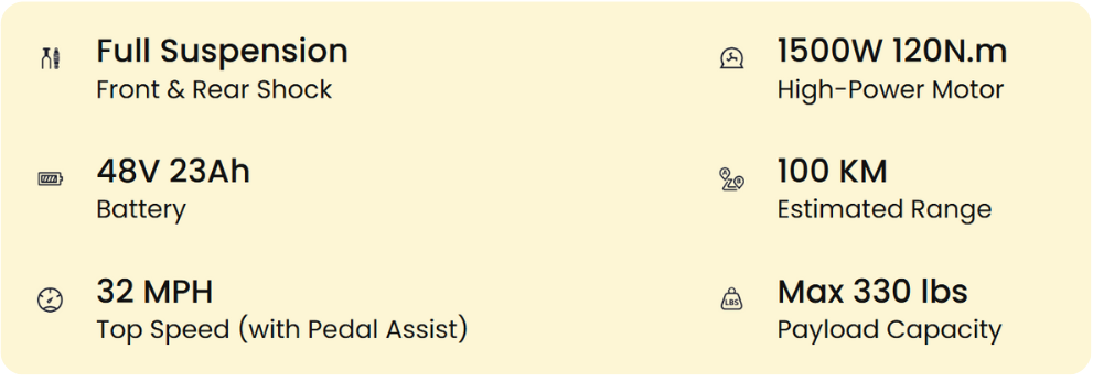 A long-range electric bike built for both adventure and productivity. Perfect for campers who love to explore without limits and delivery workers who need dependable range and efficiency. Enjoy exceptional value, a seamless riding experience, and the highest level of safety on every journey.